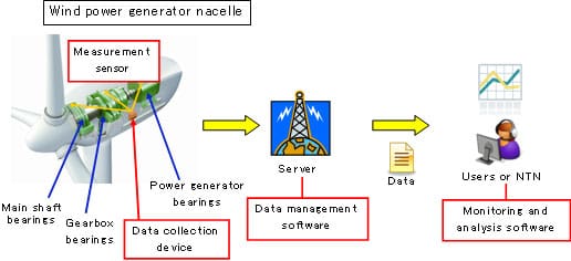 The nacelle*3 of wind power generators generally comprises of main shafts, gearboxes, power generators, and many mechanical components, such as bearings, and gears are built in. If defects in these bearings, gears and other components are discovered too late, problems may spread throughout the entire wind power generator and increase maintenance costs and man-hour, and also result in long periods of time without power being generated. Recently constructed offshore wind power generators in particular are much larger than their onshore counterparts, and access to the generators themselves can be extremely difficult, which means the risk of finding defects too late has increased.
