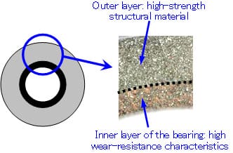 The newly developed “Multi Layer BEARPHITE” is an oil-impregnated sintered bearing that features the internal layers of the bearing made of a material with a high-strength and outstanding wear-resistance, and the outer layers made of a high-strength structural material, in what is the world’s first double-molding method*1. The use of high-strength structural material for the outer layers of the bearing eliminate the need for special heat treatment, and greater dimensional precision with the sizing*2 process using a press means conventional cutting process is no longer required.