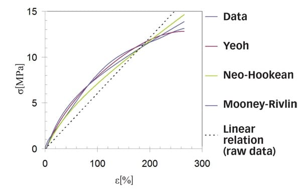 Many of the engineering calculations done today are based on the assumption that the material behaves linearly and elastically – that is, that force and displacements are linearly dependent on a constant, which is called stiffness. Rubber materials in general behave non-linearly. It is not enough to define one constant to relate force to displacements or stress to strain. Instead, rubber requires more complex constitutive models that can handle multi-axial non-linearity.