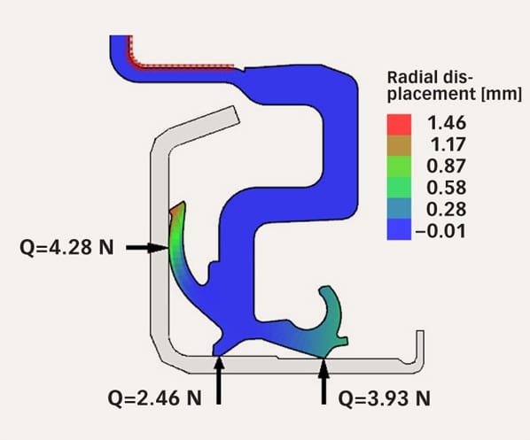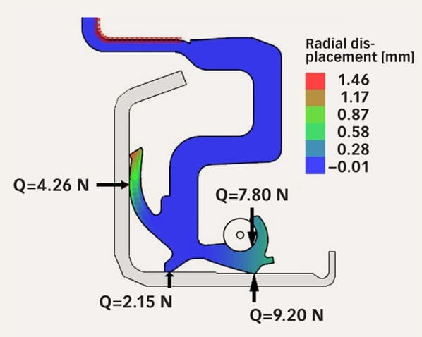 Sealing elements need to be installed in the working position with a certain given interference between the bore and the shaft. Therefore, it is crucial to be able to simulate the contact between the seals and the surrounding surfaces (such as housings, shafts, flingers or bearings) (figs. 4 and 5).