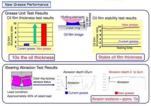 In response to this situation, NSK has successfully developed a new grease with redesigned properties that sustain the oil film between the roller and the inner and outer rings even under harsh conditions. This results in about 10 times the level of abrasion resistance on the bearing raceway surface compared to the current product, which makes for longer bearing life.