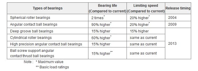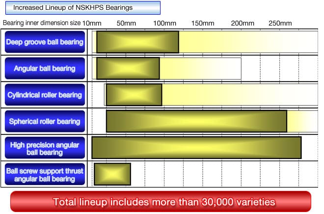 To meet the high demand for NSKHPS, NSK has added four new bearing types to expand its lineup to a total of six types for a total of 30,000 varieties of NSKHPS products to match all types of industrial machinery by means of full line up of NSKHPS.