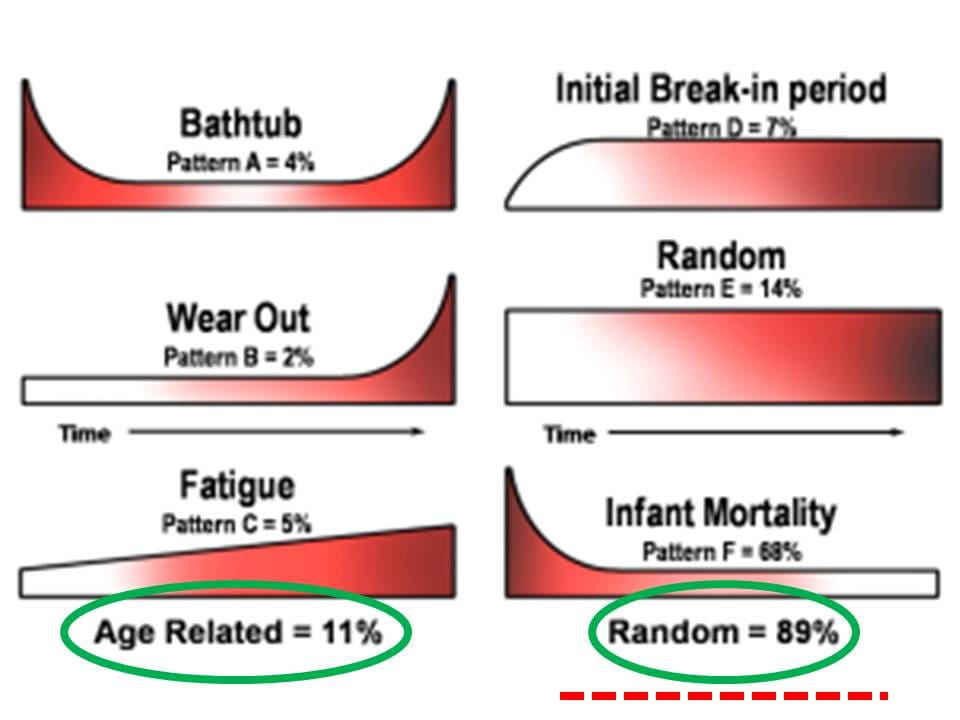 Lost in all of this is the concept of ensuring and sustaining reliability as both corrective and preventive maintenance is performed. Ideas about how things fail that we used to rely upon as a basis for preventive maintenance have been shown in the four failure profile studies over the past 40 years to apply to only a minor percentage of failures. In gambling terms, this means that odds are very long against a “win.” From this it can be shown that time directed maintenance, in general, also should apply to only a minor portion of the failure modes which an organization must correct or mitigate. This is because we seldom know the profile for a failure and assume that most components exhibit a “wear-out” characteristic, but assign a frequency for maintenance anyway, as if they did.