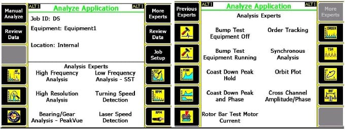 – Fourteen predefined analysis experts (such as coast down, bump tests, time synchronous averaging, order tracking, MCSA, high resolution, high frequency, etc.) for troubleshooting difficult machine problems