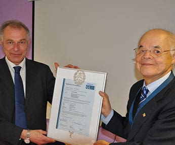 Dr. Karl Steingroever (left) presents Dr. Peter Poon, CEO, Romax Technology with 25th Certification