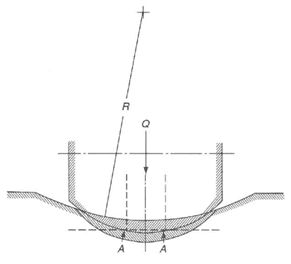 Figure 5: Detail of contact of ball bearing-path of ball showing the average RADIUS after deformation as well as two points A – A where there is purely rolling. [Tedric A. Harris, 2007, Advanced Concepts of Bearing Technology, Taylor & Francis Group, 45 CRC]