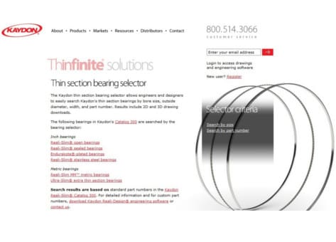 “The selector makes it easy for engineers and designers to search our standard thin section bearing catalog by dimensions or part number,” said Les Miller, Kaydon vice president of engineering. “Results include 2D and 3D drawing downloads, making the selection process easier.”