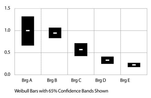 For statistical comparison purposes, the life test results are shown bracketed with 65% con?dence bands. The width of these bands is calculated based on the sample size and scatter of testing failures and is a function of the Weibull slope. When such bands overlap between test groups, no statistically signi?cant difference in performance can be claimed at the 90% con?dence level.