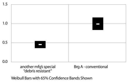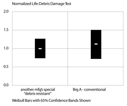 Testing has also been performed with a conventional product from one manufacturer (Brg A) and special “debris resistant” products from two other manufacturers. Here the special debris resistant products were claiming up to ten times life improvement over conventional processes.