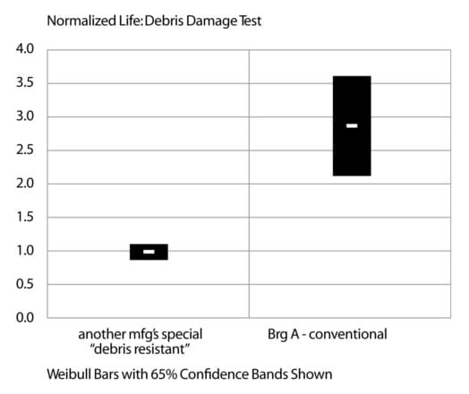 3) Standardized life testing with debris showed that conventional and debris resistant bearings from various manufacturers perform at signi?cantly different levels. These differences should be considered when making comparisons concerning the relative hierarchy of product debris resistance and when applying performance prediction tools.