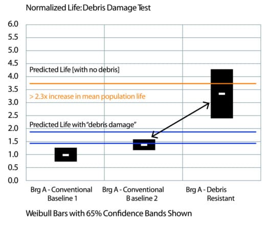 The debris resistant bearing performance was shown to be much higher than the baseline groups with its upper 65% con?dence band crossing the line for predicted life with no debris damage. Thus the new debris resistant bearing negated the effects of the given debris damage and increased mean population bearing life by up to 2.3 times over the two baseline bearing groups made with conventional processing. This debris resistant bearing is currently being offered as providing up to 2 times life improvement in debris environments.