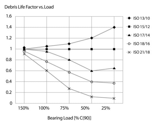 The analysis of typical life test lubricant taken from standard life test machines have shown that the base cleanness level is ISO 15/12. The debris life factor has a value of 1.0 at this cleanness level. Cleaner lubricant would provide enhanced life and lubricant with more debris would give a reduced life.