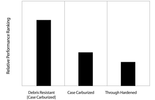 In Figure 2, it is shown that bearings made of through hardened steel can be more sensitive to debris dents than bearings made of case carburized steel. Figure 6 shows that case carburized bearings can be made even more debris resistant. Figure 9 shows the difference in model debris life factors for bearings made of these materials relative to case carburized bearings for a moderately contaminated environment. Bearings made of through hardened steel will have a somewhat lower life than case carburized bearings. As might be expected, the debris resistant bearing microstructure is seen to be more effective in improving bearing life in the more contaminated environments.