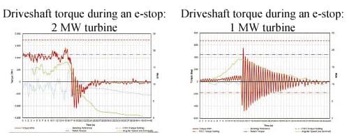 Right: The red trace plots a high wind TTR event on a 1 MW wind turbine during an emergency stop. At about the 15 sec mark the torque oscillates from positive to negative.