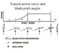 The graph Typical power curve and blade pitch angles also shows the pitch angles of a typical modern turbine. At low-wind speeds, the blades are in a fully feathered position about 90° to the plane of rotor sweep. In region II, the blades rotate to about 0° pitch angle to extract the maximum power, capturing close to 50% of the wind’s available power. In region III, the blades are pitched back to protect the turbine from high stresses as it strives to control and maintain full-rated power. At cut-out speed, the blades are quickly pitched to provide braking to safely decelerate and shutdown the turbine drive system.