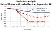 The red dotted trace plots the torque reversal magnitude and rate of change for a 750 kW turbine without asymmetrical torque control. The blue trace plots the same with an asymmetrical torque control in place and shows its effectiveness in reducing maximum reverse torque, and rate of the reverse torque increase.