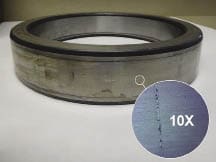 Axial cracking failure mode of a bearing mainly occur on the inner ring typically mounted to a shaft with an interference fit. The ring is heated during assembly onto the shaft. When the ring cools, it shrinks – holding the ring in place, but also creating tensile stress in the ring that increases the possibilities for axial cracking. An axial crack failure of the inner ring can be caused by excessive hoop stresses during installation but this does not appear to be the general case in the wind industry. Microscopic, white-colored areas at the edge of the cracks when the bearings are sectioned and etched are a key indicator that this is not merely standard hoop-stress failures. These cracks are termed WEC and are commonly found in through-hardened bearing races. When WEA damage causes flaking or spalling, it may be termed White Structure Flaking (WSF). This generally occurs in carborized raceways. Either way, the damage starts with the creation of WEAs.