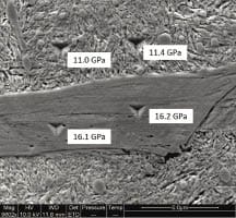 A microscopic WEA formation with nano hardness measurements showing a 44% increase in hardness.