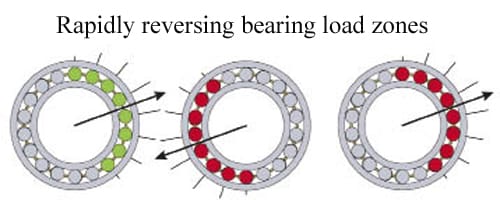 During normal operation, rollers in the bearings are aligned and rolling at the expected or design speed while they are in the load zone. As they leave the load zone, the rollers slow down and can misalign within the tolerance of the cages. As they approach the load zone again, they are gradually brought back into alignment and smoothly accelerate to support the load. In a rapid load zone reversal, the unloaded rollers opposite the normal load zone are suddenly loaded while in this misaligned state. This rapid loading increases the load concentration of the rollers in the middle of the inner race.