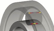 The yellow and red areas identify highest stress locations in a bearing during transient torque reversals.