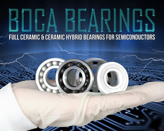 Boca Bearings offers many different bearing styles that are appropriate for use in both semiconductor equipment and semiconductor manufacturing. Ceramic bearings are capable of accommodating the many challenging conditions present during the stages of semiconductor production; from furnace temperatures that can reach close to 2500°F to clean-room 1 air quality.