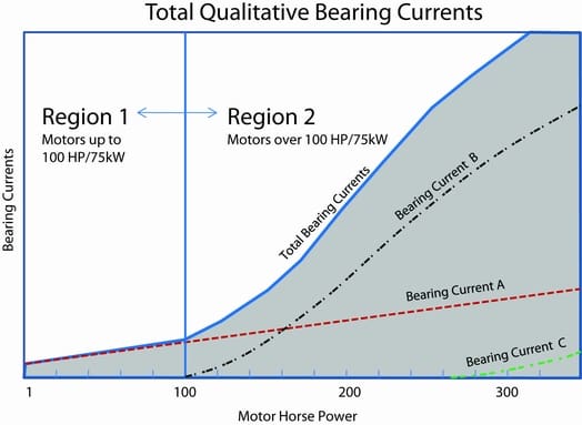 The bearings of VFD-driven motors can be damaged by currents from three sources: capacitive induced shaft voltage (A), high-frequency flux produced by common-mode voltage (B), and sinusoidal voltage (C).
