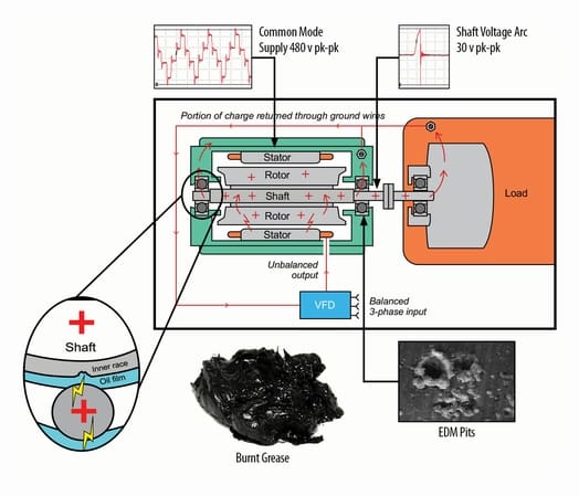Voltages arcing through the bearings of VFD-driven motors create thousands of pits, which cause increased friction and noise and the potential for costly unplanned downtime as bearing grease deteriorates.