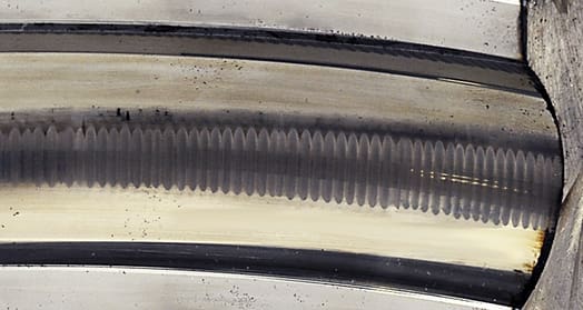 In a process called fluting, pits form washboard-like ridges on a bearing race wall — ridges that cause still more noise and vibration and accelerate bearing failure.