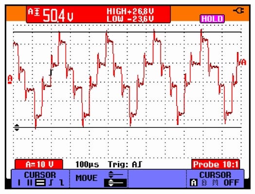 The six-step (or square) oscilloscope waveform shown here is typical of motors exhibiting maximum peak-to-peak shaft voltages, but no discharges through the bearings.