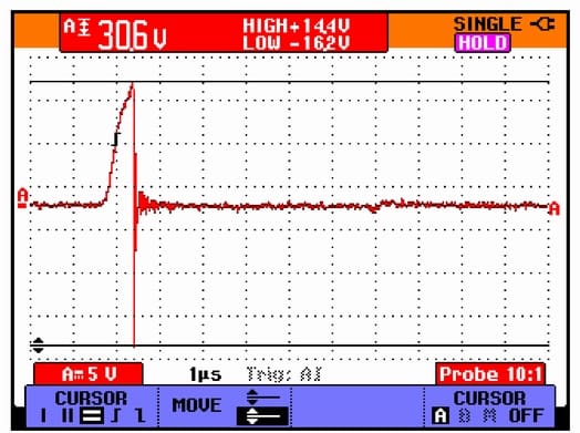The above waveform shows the rapid voltage discharge through the motor’s bearings that occurs when shaft voltages reach a level where they overcome the dielectric properties of bearing grease.