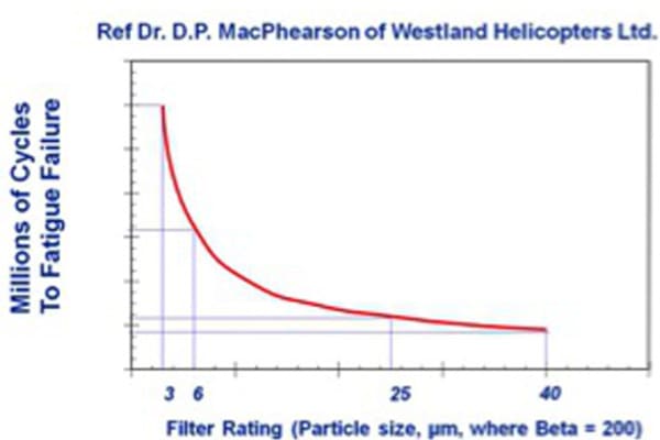 The effects of particle contamination on bearing life is supported by a research project conducted by Doctor MacPhearson, which looked at the relationship between filter ratings and millions of bearing cycles to fatigue failure. See figure 2