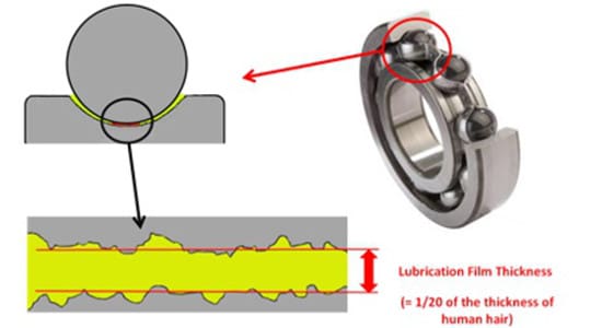 In a bearing with a good average lubrication film thickness, the metal surfaces are separated and the average thickness of this separation or film is very small, in fact it is about one twentieth of the thickness of a strand of human hair. See figure 1