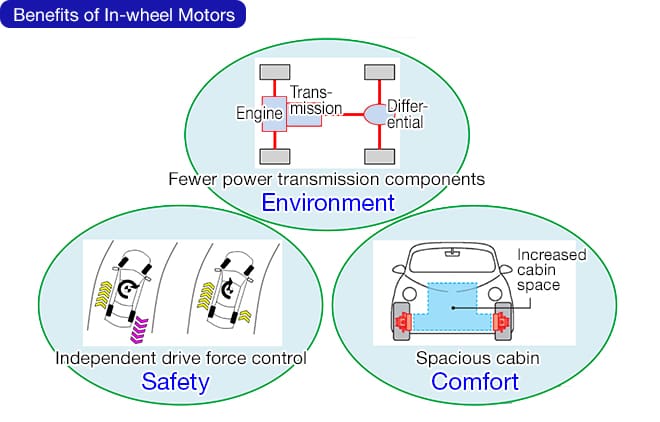 In-wheel motors that can work with various drive systems independent of the body structure of automobiles are attracting attention as next-generation drive devices. An in-wheel motor located near the wheel can reduce the weight of the vehicle body by reducing powertrain parts such as engines, controlling the drive force of each wheel, and expanding the size of the cabin space, thereby improving environmental performance, safety, and comfort (Fig. 2). For this reason, a great deal of research is being conducted for the practical application of this technology.