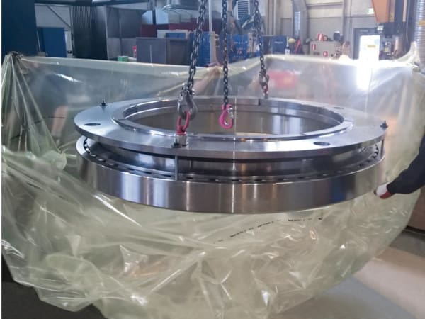 After a full and detailed assessment of the application and its requirements, NSK set about developing bearings with a higher static load rating and user-specific dimensions to replace the existing tapered roller bearings. In total, six 1800mm internal diameter bearings were manufactured, weighing 2250kg each. Prior to shipping, NSK specialists devised a strategy for simultaneously installing the inner and outer ring on the gearbox sprocket wheel with the assistance of a specially designed tool.