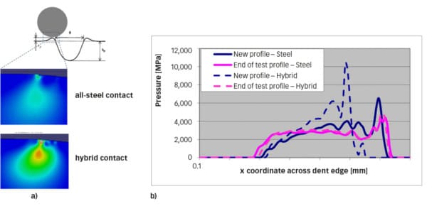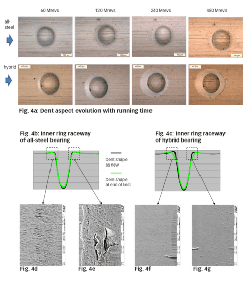 The good resistance to surface distress and boundary lubricated condition-related damage around the dent where the film collapses was shown to lead to longer dent life for hybrid bearings.