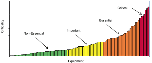Criticality is a quantitative ranking process based on: operational cost, maintenance cost, throughput losses, quality, safety, and environmental implications. The graph below represents the criticality distribution of the equipment at a typical plant (Figure 1). Only 10% of the equipment at this plant is deemed critical due to the costs incurred if placed out of service. 25 percent can be defined as essential. 30 percent is important. The remaining 35% is non-essential. Each criticality level can be paired with an effective maintenance strategy to balance the cost of implementation with the required reliability levels.