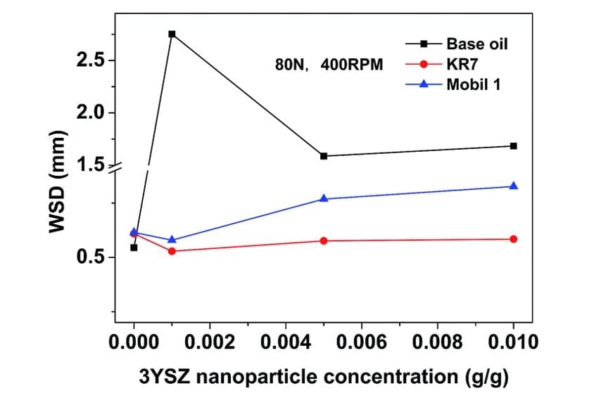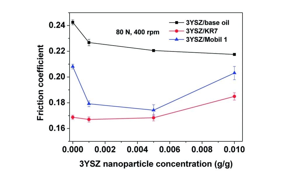The Y2O3-stabilized ZrO2 nanoparticles were synthesized using surfactants to control their quality and size. The nanoparticles were effective in reducing the friction coefficients (Figure 2) and improved the anti-wear properties (Figure 3) of the commercial oils. Based on the tribological properties of the resulting lubricants, the optimal nanoparticle concentration was found to be 0.1-0.5 wt%.