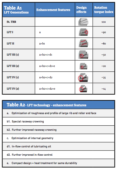 Additionally, by applying special heat treatment to the outer surfaces of the bearing material, a smaller tapered roller bearing could be selected, further reducing the friction while keeping durability at the same level (LFT III 2). The effects of all these developments on the bearing friction torque can be seen in Table A1&2.