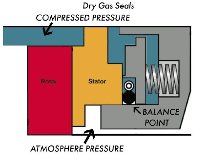 Dry gas seals are also balanced, meaning that the pressure being sealed can come behind the stationary seal face. This means the pressure being sealed is squeezing the two seal faces together. This pressure is also trying to get between the two seal faces and push them apart. The hydrodynamic pumping grooves in the face of the seal create enough extra pressure in the gap to keep the two faces from touching. This is a relatively narrow margin and dependent on conditions like speed and cleanliness, but dry gas seals have virtually replaced all oil seals in new compressor builds.