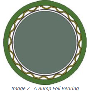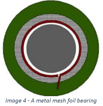 A third type of foil bearing, Metal Mesh foil bearings have been attracting a lot of interest and research in recent years. The idea is like the BFB in that there is a continuous top foil, but it is supported by a metal wire mesh, sort of like a sponge rather than bumps. The mesh may be of stainless steel, aluminum or copper. The friction losses between the wires in the mesh as they “spring” is said to result in a damping mechanism that is insensitive even to the high heat levels in gas turbines.