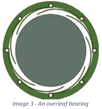 provide the classic wedge-shaped gas gap and reduce whirl and whip instabilities, but the bending of the leaves produces even less damping than the friction losses in the BFB. It is though, relatively easy to get some preload, that is a bearing inner ID smaller than the shaft OD without shim. It is also common to see the Overleaf design in thrust bearing applications.