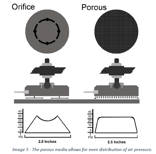 Porous compensation also works well for very small gaps and so small flows, as porous bearings do not experience collapse. With a porous bearing as described earlier with 10sq.in. of area and 100psi supply pressure, the bearing will be in “balanced force mode” with 1000lbs. of load. That is an interesting lubrication regime where there is zero lift and so zero flow but yet zero load and friction between the faces, as the load is taken by the air pressure acting like a hydraulic cylinder. It is not recommended to run a bearing in this mode, but it is another example of why porous compensation has better crash resistance and is more robust then orifice compensation.
