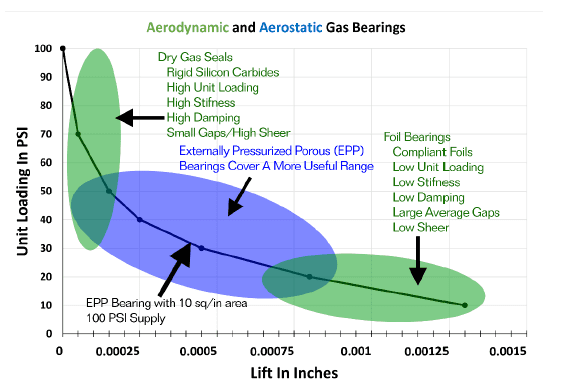 The accompanying chart helps to conceptualize gas bearing lubrication technology in turbo equipment. It is a lift vs load chart for the Externally Pressurized Porous (EPP) gas bearing scribed above that has 10sq.in. of bearing face, 100psi is fed to the bearing as the load on the bearing is increased. Resulting air gaps are shown on the bottom axis. The slope of the curve around any load point is representative of the film stiffness at that load. This curve also is similar to curves seen for DGS or eccentricity plots used in rotor dynamics so, the typical operating regions of dry gas seals and foil bearings are superimposed as is the operating area for EPP Bearings.