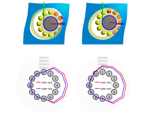 The elastic deformations of bearing rings lead to differences in the load distribution within the bearings as can be seen in the following simple example with a horizontal load on the bearing. The left case does not consider deformations of the bearing and the right image takes into account these deformations of the bearing rings.