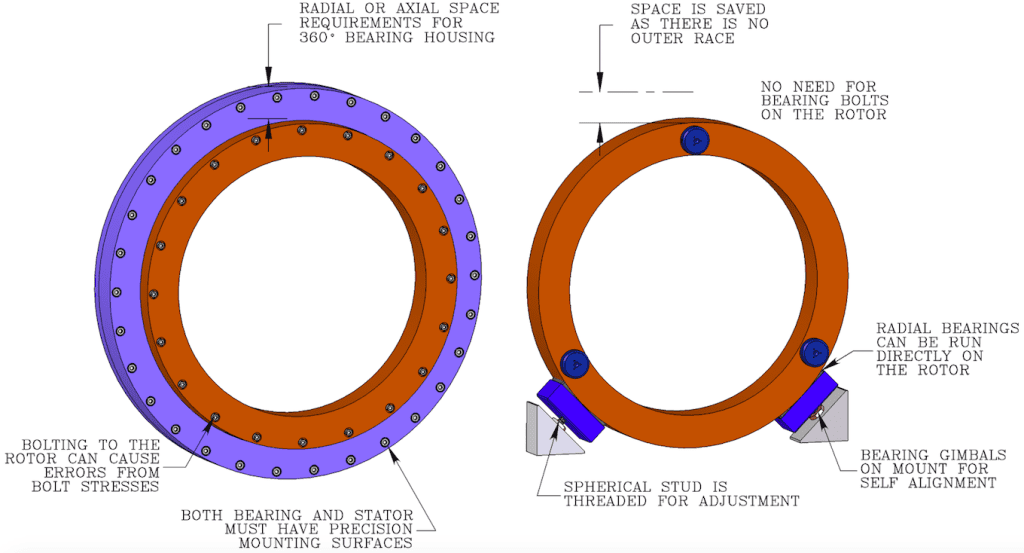 This conversation about precision leads to other cost and bearing life issues. Large roller bearings or slewing bearings require a continuous and precise mounting surface on the stator to receive (and since nothing is perfect elasticity average) the mounting of the precision machined stator side of the bearing. The same precision surface is required on the rotating component being supported that bolts to the rotating bearing race. Machining inaccuracies in any of these surfaces can cause huge increases in the Hertzian contact stress of the rolling elements and raceways.