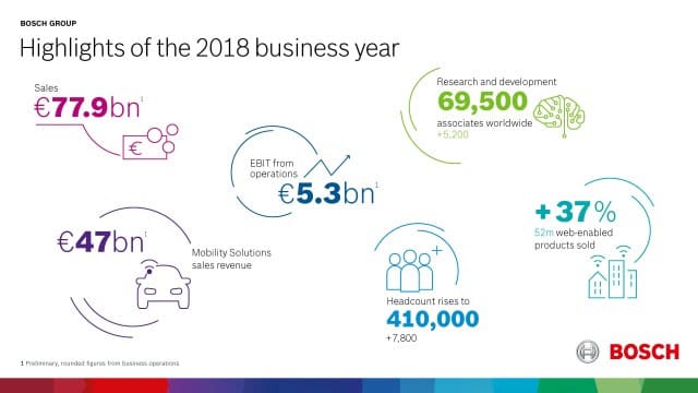 The Bosch Group is continuing on its successful course: despite the difficult economic conditions and weak markets, sales and result in 2018 once again reached last year’s level, which was an all-time high. According to preliminary figures, the supplier of technology and services generated sales from operations of 77.9 billion euros last year. Sales results were hit hard by exchange-rate effects to the tune of 2.1 billion euros. Adjusted for exchange-rate effects, revenue rose 4.3 percent.