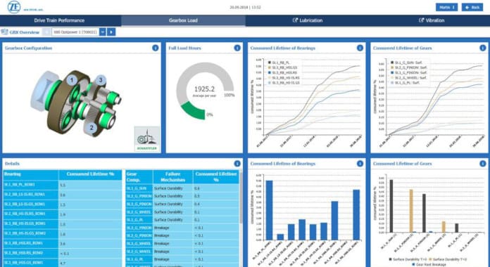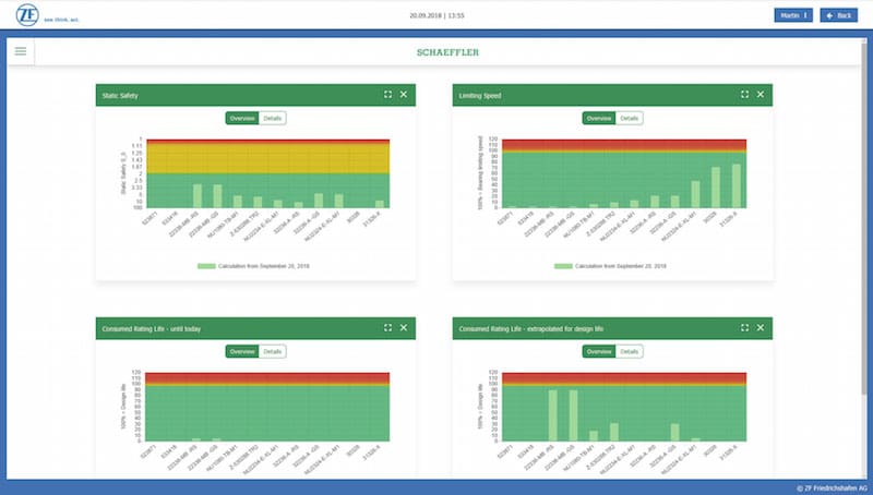 In the solution that is currently installed, pre-processed data from the condition monitoring system and other sensors are transmitted to the ZF cloud, while torque and speed data are forwarded to the Schaeffler cloud, where a detailed simulation model of the ZF gearbox has been implemented as a virtual twin. The calculation results from the virtual twin are transmitted back to the ZF cloud and are then available on the ZF software’s dashboard for use in monitoring the gearbox’s condition.