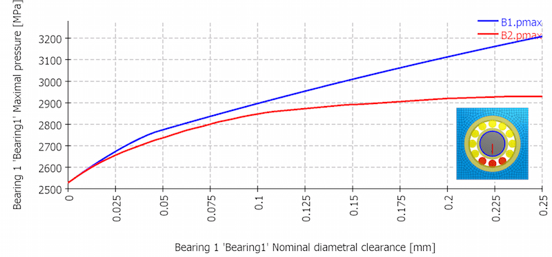 In image 2 the blue curve shows the contact stress of the bearing with internal clearance, while the red curve shows the contact stress with zero internal clearance but clearance between outer ring and housing. The range of the clearance can be divided into three parts. For small clearance both cases show identical results, then there is a range with a constant difference between the two curves. The reason for this is the bending stiffness of the ring. In a third range the contact stress approaches a constant value in case with clearance to the housing. The usual operating conditions of the bearing should be below 0.05mm, the diagram was only extended to give an impression what will happen for large clearance.