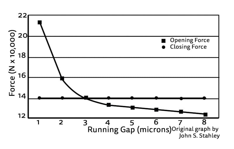 faces. This force is created by an aerodynamic bearing principle, where fine pumping grooves help encourage gas from the high-pressure process side of the seal, into the gap and across the face of the seal as a non-contact fluid film bearing. As the closing force on the faces goes up, this aerodynamic bearing layer will get thinner but stiffer, as shown by Stahley (Image 1).