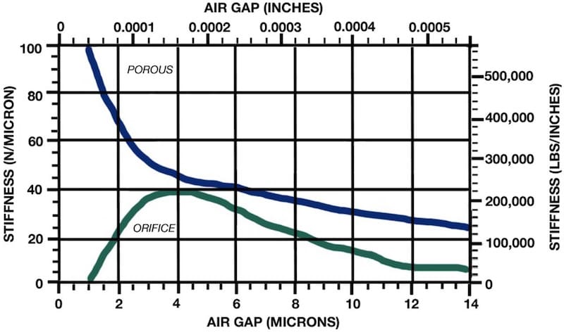 pressure in the gap will equal the total load on the bearing divided by the face area, this is unit loading. If this source gas pressure is 60 pounds per square inch (psi) and the face has 10 square inch of area and there is 300 pounds of load, there will be an average of 30 psi in the bearing gap. Typically, the gap would be about 0.0003 inches, and because the gap is so small, the flow would only be about 0.2 standard cubic feet per minute (scfm). Because there is an orifice restrictor just before the gap holding pressure back in reserve, if the load increases to 400 pounds the bearing gap is reduced to about 0.0002 inches, restricting flow through the gap down 0.1 scfm. This increase in the second restriction gives the orifice restrictor enough flow to allow the average pressure in the gap to increase to 40 psi and support the increased load.